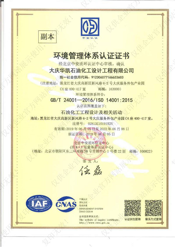 環(huán)境管理體系認證證書
